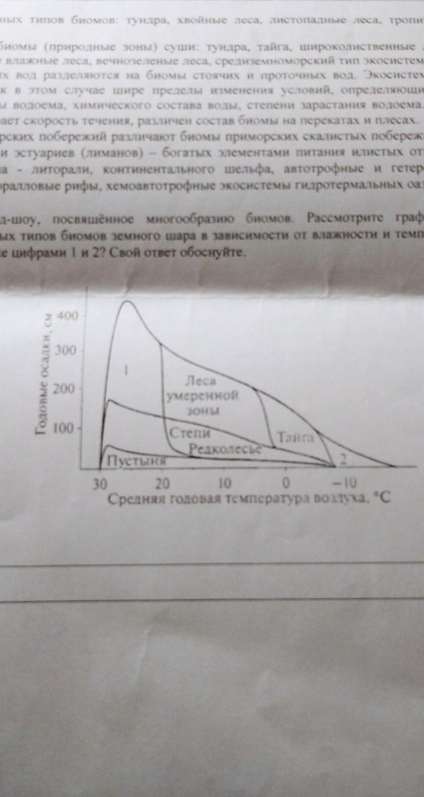 рассмотрите график, иллюстрирующий расположение основных типов биомов земного шара в зависимости от влажности и температуры. какие биомов обозначены на графике цифрами 1 и 2? ответ обоснуйте