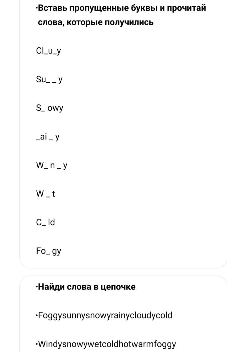 windy snowy wet сold hot warm foggy это и что выше цепочка, если надо