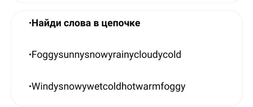 Ответ:Foggy, sunny, snow, yrainy, cloud, cold.