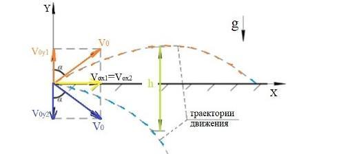Так как горизонтальные проекции их начальных скоростей одинаковы, то мысленный отрезок, их соединяющий, все время будет оставаться вертикальным и расстояние между шарами совпадет с разностью их вертикальных координат: