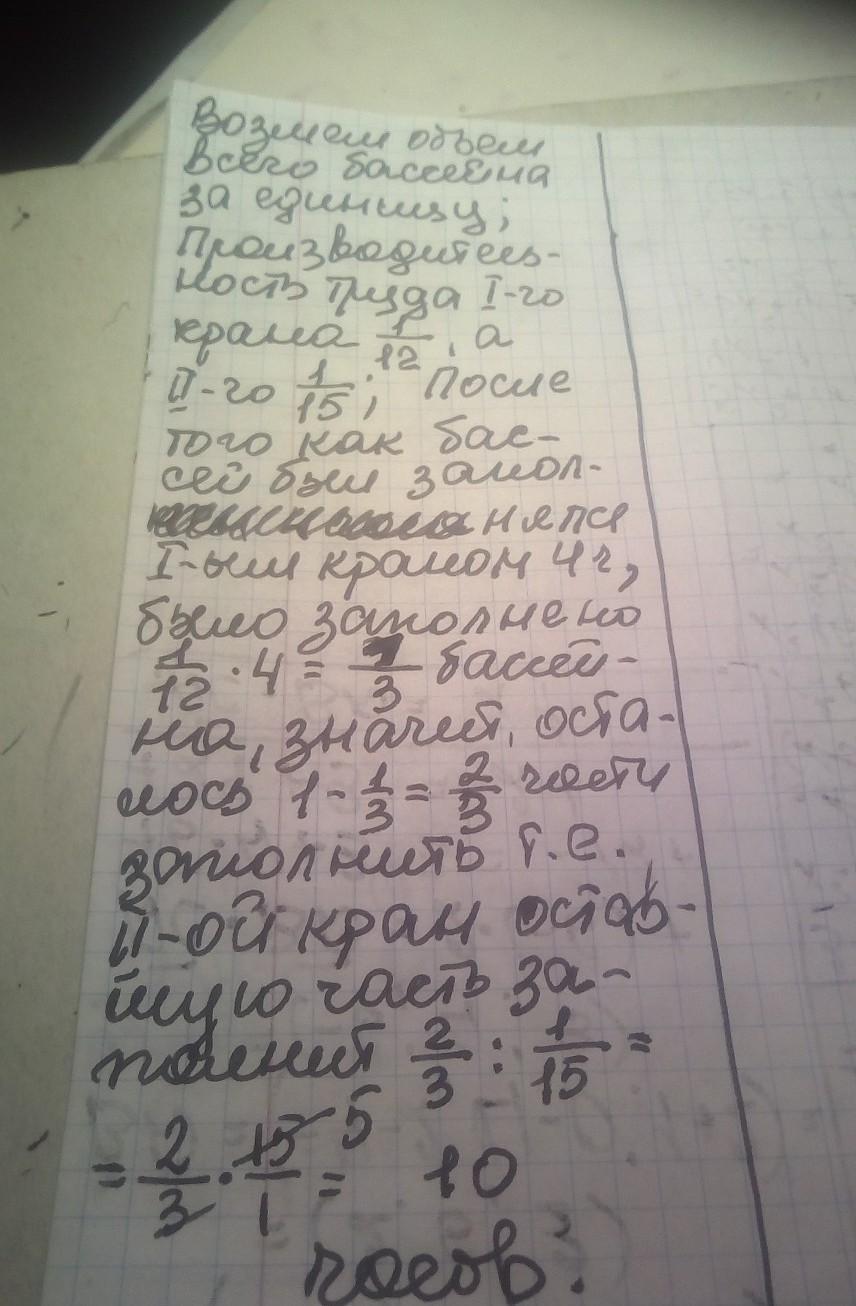 Первый из кранов пустой бассейн заполняет за 12 часа , а второй кран за 15 часов.