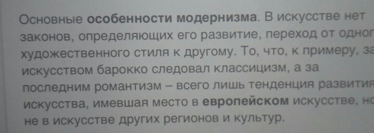 Модернистские инновации включали абстрактное искусство , роман о потоке сознания , монтажное кино , атональную и двенадцатитоновую музыку, а также раскольническую живопись. Модернизм явно отверг идеологию реализма и использовал произведения прошлого путем повторения , включения , переписывания, перепросмотра , пересмотра и пародии . Модернизм также отверг несомненность мышления Просвещения , и многие модернисты также отвергли религиозные убеждения. Примечательной характеристикой модернизма является самосознание художественных и социальных традиций, которое часто приводило к экспериментам с формой, наряду с использованием методов, привлекающих внимание к процессам и материалам, используемым при создании произведений искусства.