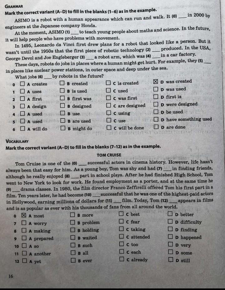 1- was used, 2- was first,3-designed, 4- used, 5- are used, 6- will be done, 7- difficulty, 8- taking, 9-attended, 10- so, 11- each, 12- still.