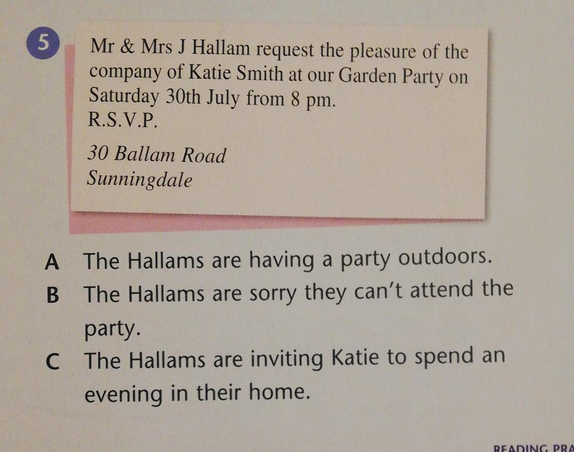 Смотри, там нужно выбрать правильный ответ.Так вот,ответ будет c:The Hallams are inviting Katie to spend an evening in their home.