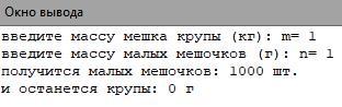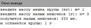 Помогите,пожалуйста! Надо перевести задачу на язык паскаля. Мешок крупы ( известен его вес в кг.) фасуют в более мелкие мешочки по n грамм. Сколько мелких мешочков получится ? И сколько грамм крупы останется?