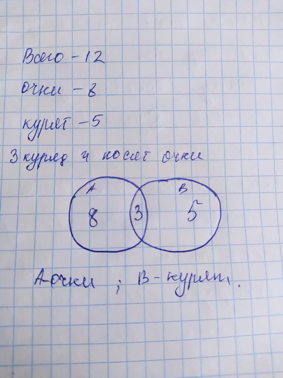 Из 12 студентов 8 носят очки, 5 студентов курят, а 3 студента