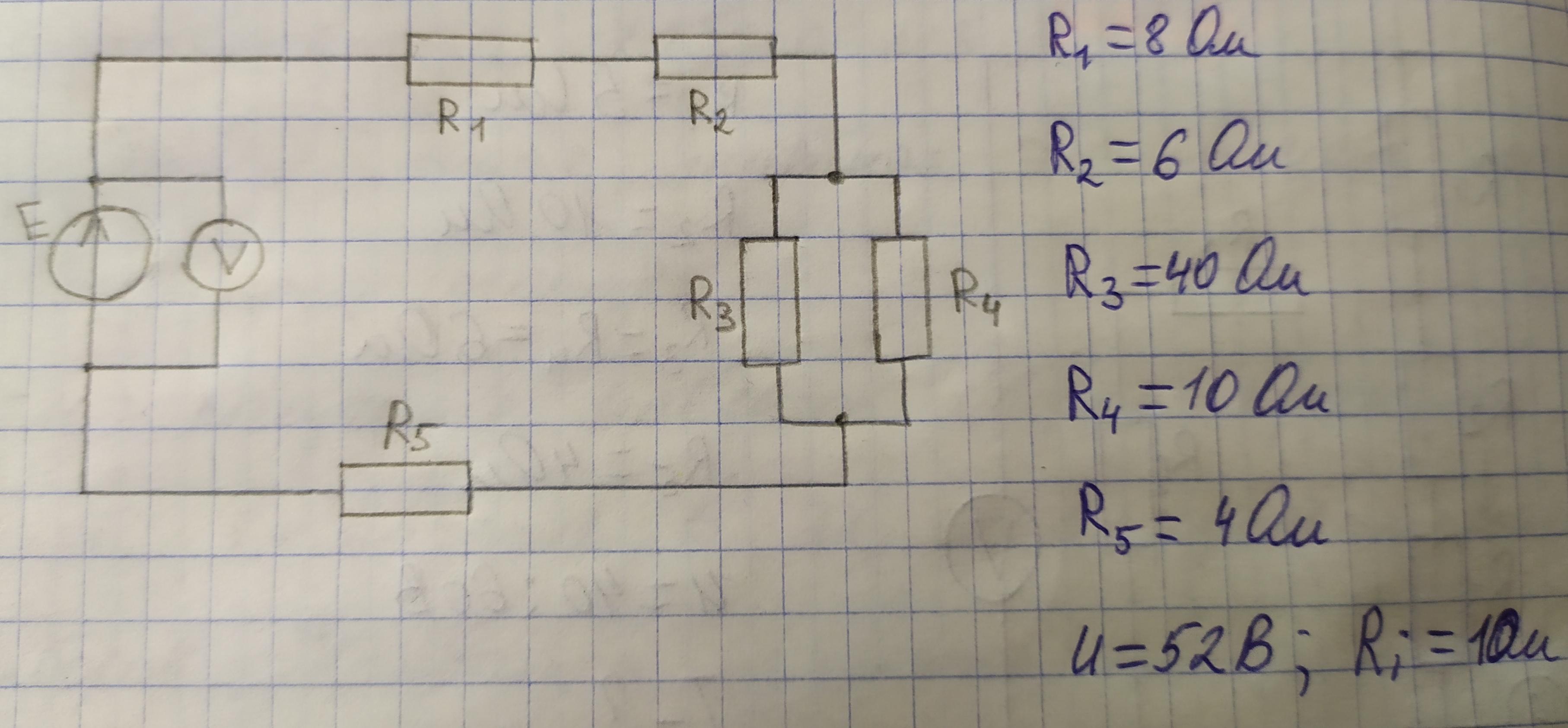 R34=40*10/(40+10)= 8 Ом, Ro=R1+R2+R34+R5=