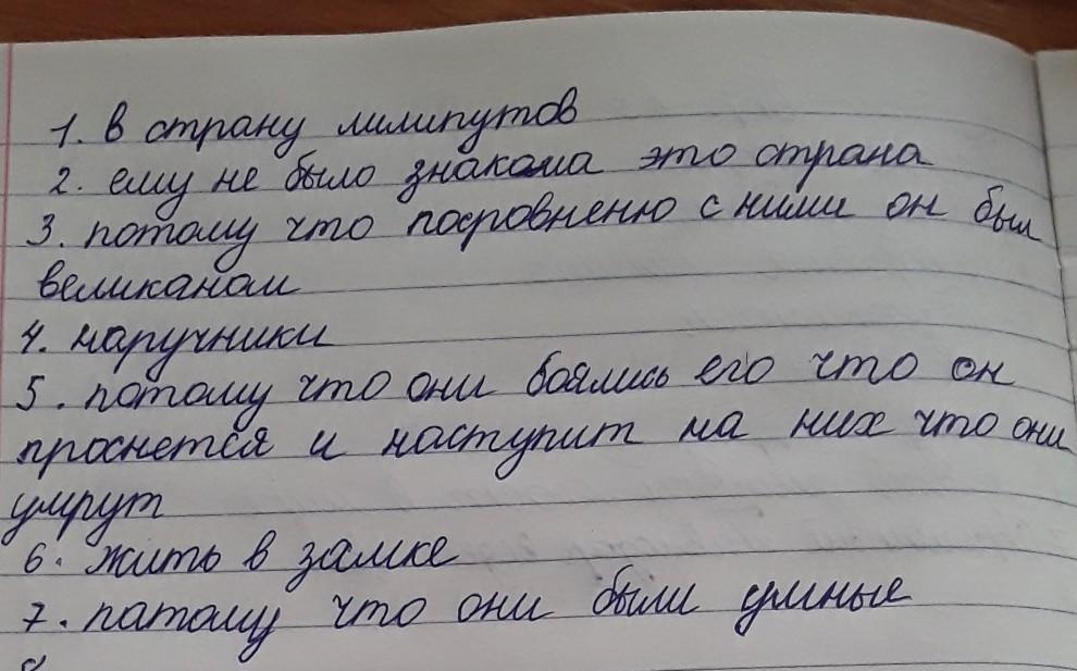 1)в страну лилипутов.2)ему не было знакома это страна. 3)потому что посровненю с ними он был великаном. 4)наручники. 5)потому что они боялись его что он проснется и наступит на них что они умрут. 6)жить в замке. 7)потому что они были умные. 8)я не знаю