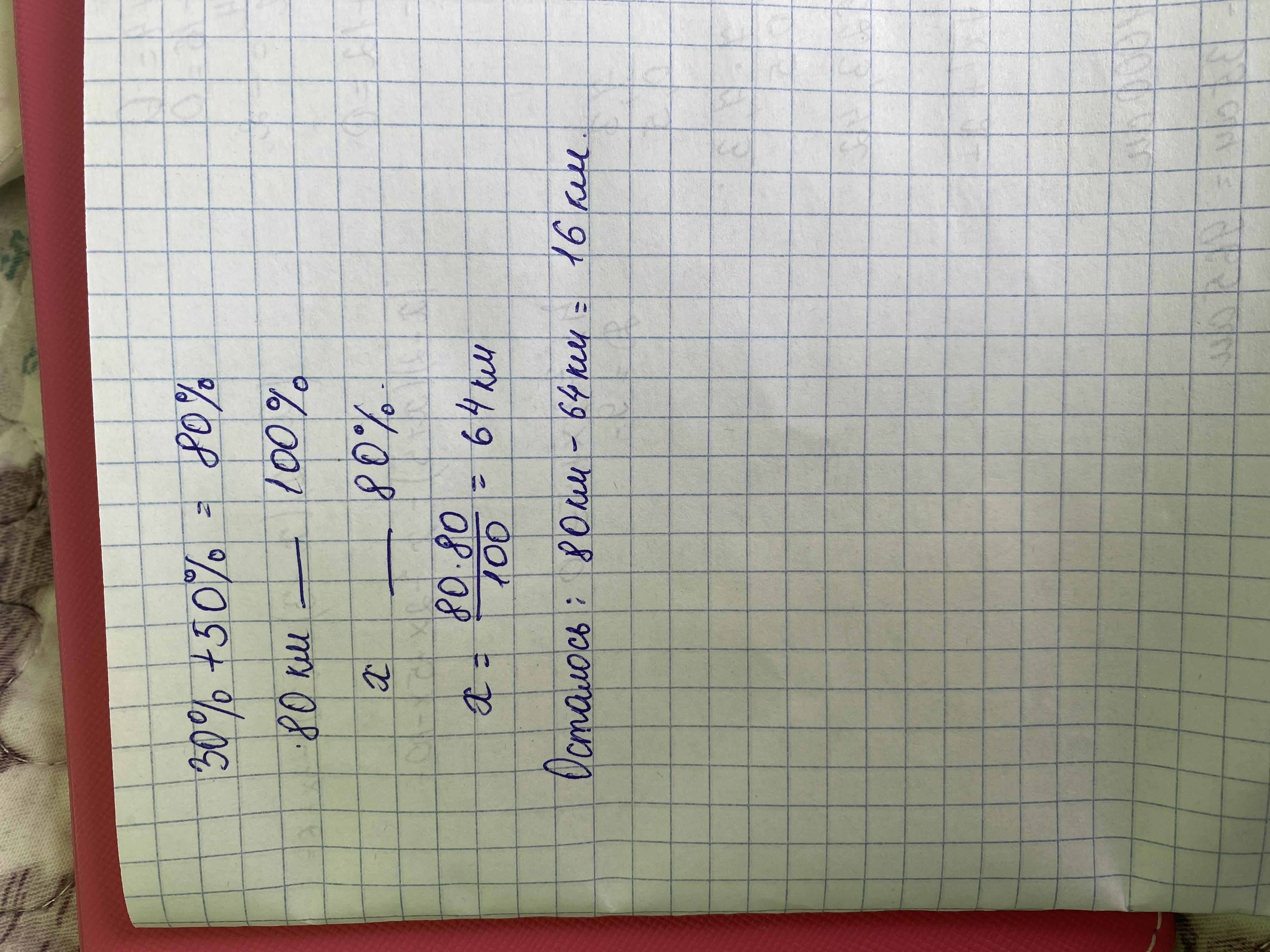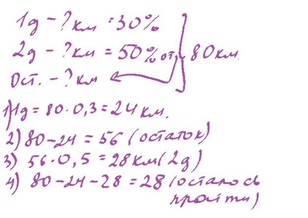Туристы должны пройти 80 км. В 1 день - 30% пути. Во 2 - 50% оставшегося пути. Сколько км осталось пройти?