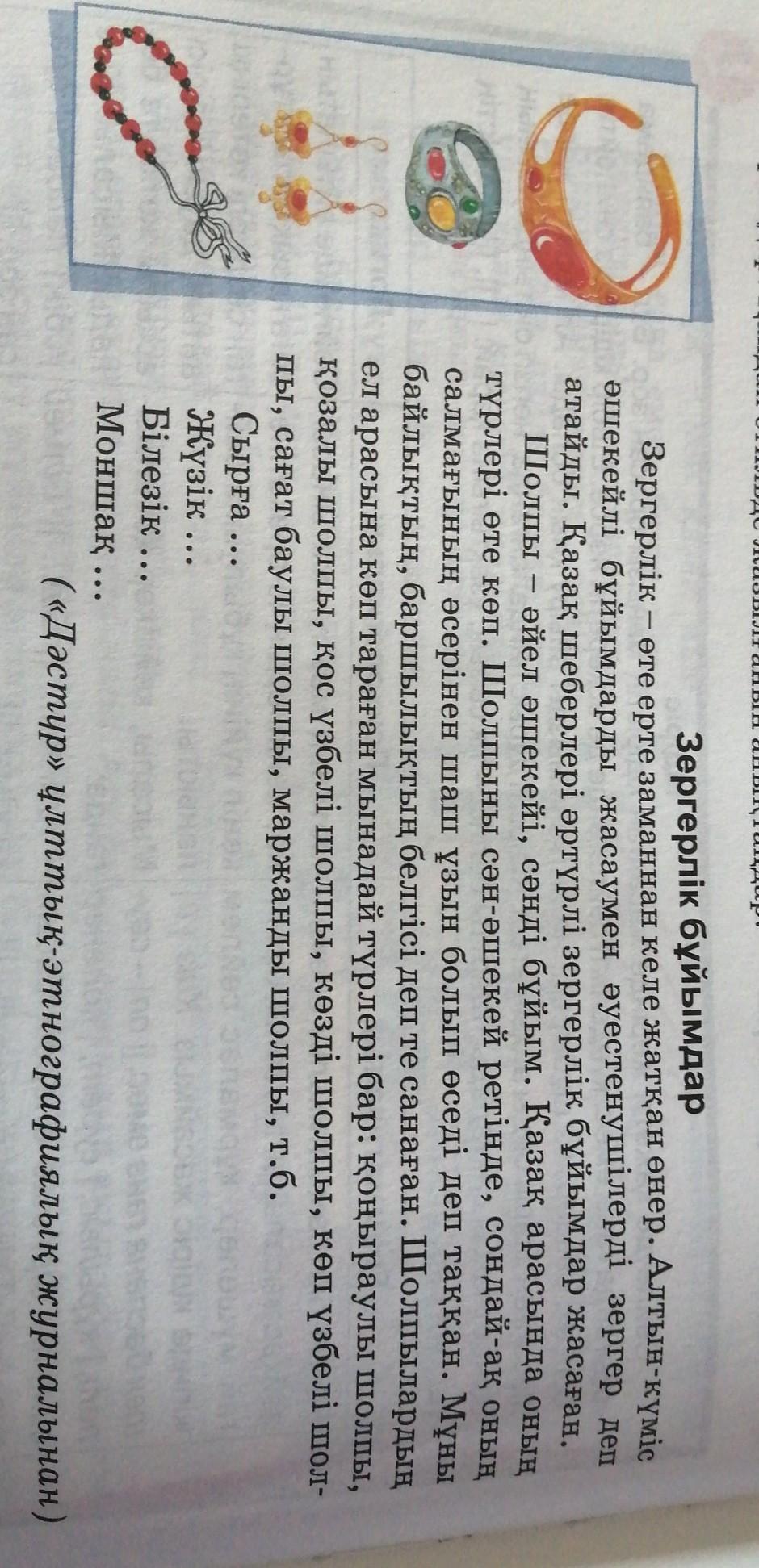 Қазақ шеберлері//әртүрлі зерг әрі қарай өзің жаз. Шолпыны//сән-әшекей ретінде әрі қарай өзің жаз. Мұны// байлықтың , баршылықтың әрі қарай өзің жаз. Осы жерлерге екпін белгісін қой.