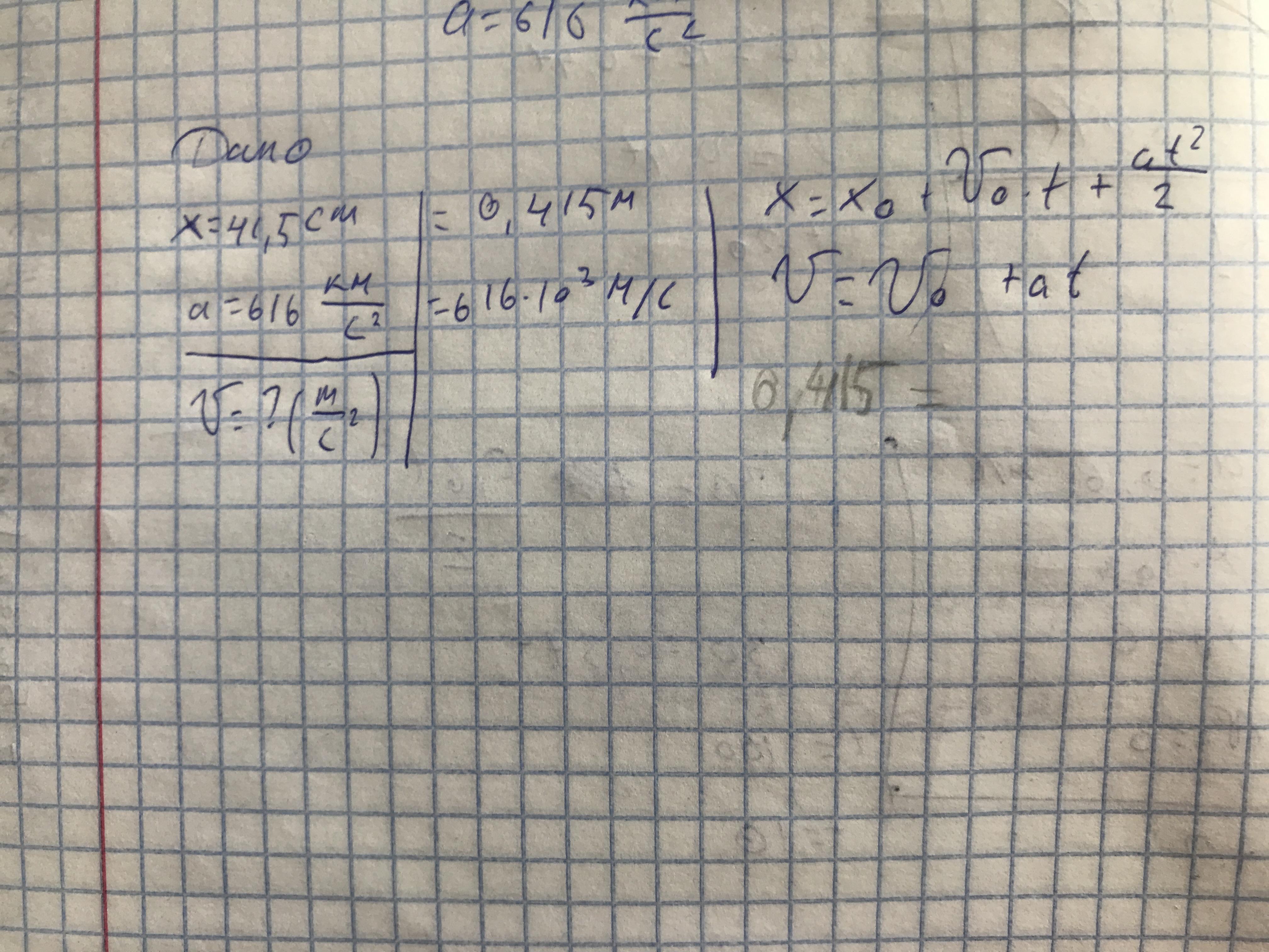 Пуля в стволе автомата Калашникова движется с ускорением 616 км/с2. Какова скорость вылета пули, если длина ствола 41,5 см?