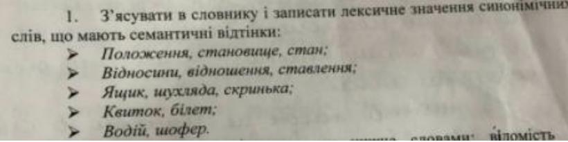З'ясувати в словнику і записати лексичне значення синонімічних слів,що мають семантичні значення