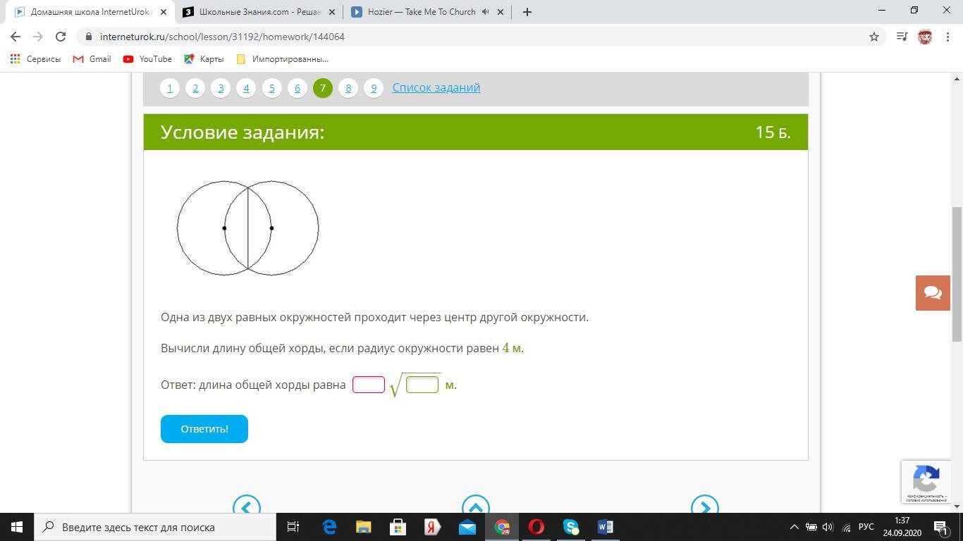если провести линии из центра к точкам пересечения окружности, то это будут радиусы, они все по 4, линия, соединяющая центры окружности, тоже радиус, тоже 4, внутри образовался ромб, где все стороны по 4, и меньшая диагональ тоже 4, дальше по теореме пифагора находишь половину большей диагонали, она будет √12 и умножаешь на 2, 2√12 или 4√3 метра.