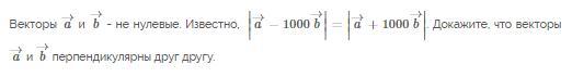 Пусть Ax, Ay, Az - проекции вектора a на координатные оси OX,OY и OZ, а Bx, By, Bz - проекции вектора b на эти же оси. Тогда проекции вектора c=a-1000*b на эти оси будут таковы: Cx=Ax-1000*Bx, Cy=Ay-1000*By, Cz=Az-1000*Bz. А проекции вектора d=a+1000*b на эти оси будут Dx=Ax+1000*Bx, Dy=Ay+1000*By, Dz=Az+1000*Bz. По условию, длины векторов c и d равны. Но /с/=√(Cx²+Cy²+Cz²)=√[(Ax-1000*Bx)²+(Ay-1000*By)²+(Az-1000*Bz)²], а /d/=√(Dx²+Dy²+Dz²)=√[(Ax+1000*Bx)²+(Ay+1000*By)²+(Az+1000*Bz)²]. Отсюда следует равенство √[(Ax-1000*Bx)²+(Ay-1000*By)²+(Az-1000*Bz)²]=√[(Ax+1000*Bx)²+(Ay+1000*By)²+(Az+1000*Bz)²]. Возводя обе части в квадрат, приходим к равенству (Ax-1000*Bx)²+(Ay-1000*By)²+(Az-1000*Bz)²=(Ax+1000*Bx)²+(Ay+1000*By)²+(Az+1000*Bz)².