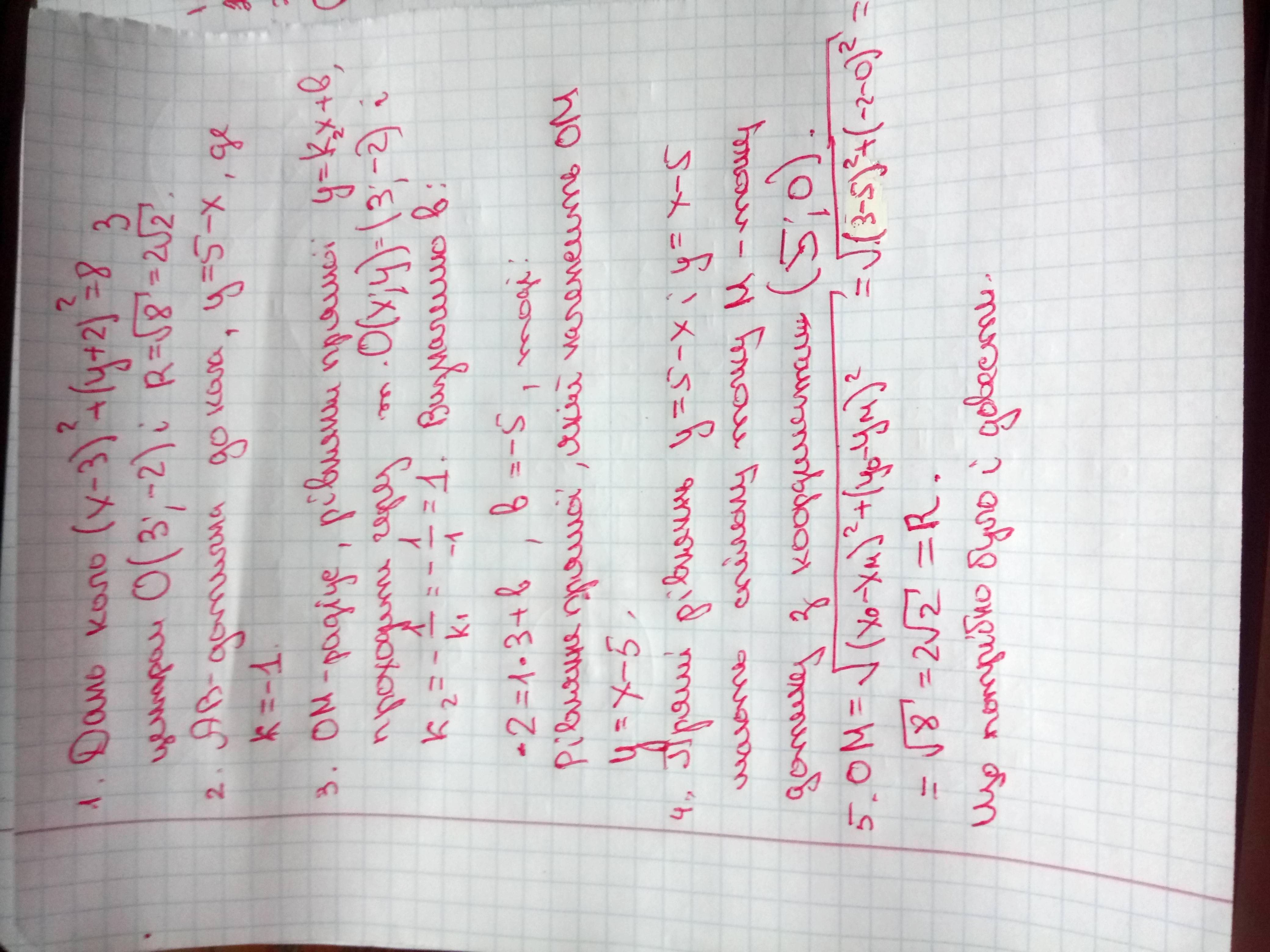 Доведіть, що пряма x + y = 5 є дотичною до кола (x – 3)² + (y + 2)² = 8 та знайдіть координати точки дотику.