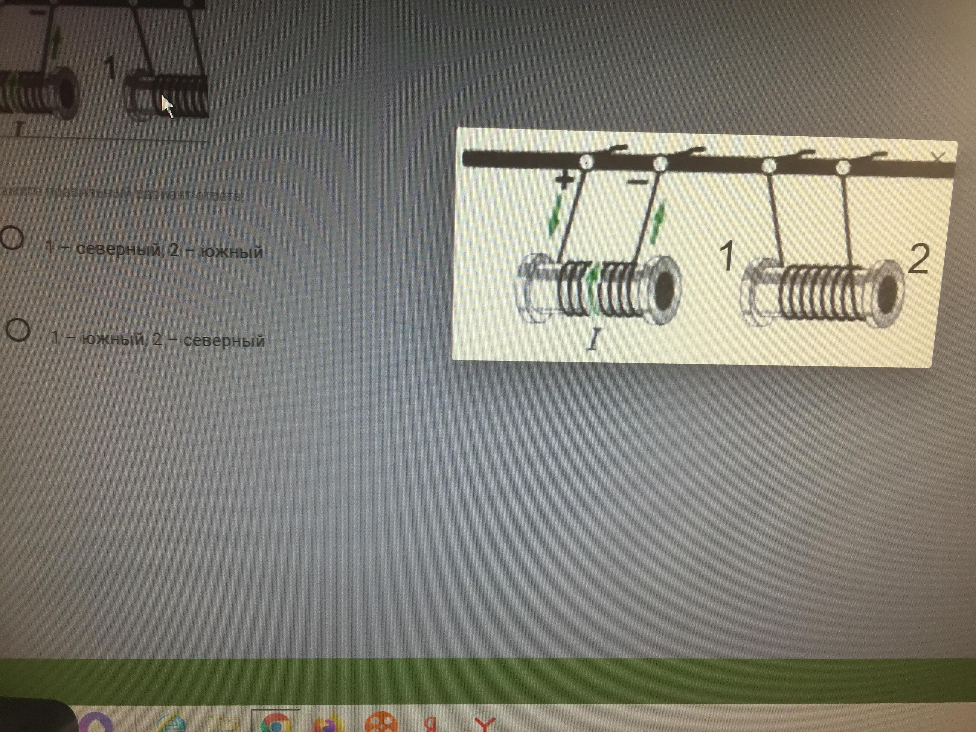 На рисунке показано взаимодействие соленоидов, по которым течёт ток. Определите, какому магнитному полюсу соответствуют полюса второго соленоида, обозначенные на рисунке цифрами 1 и 2.