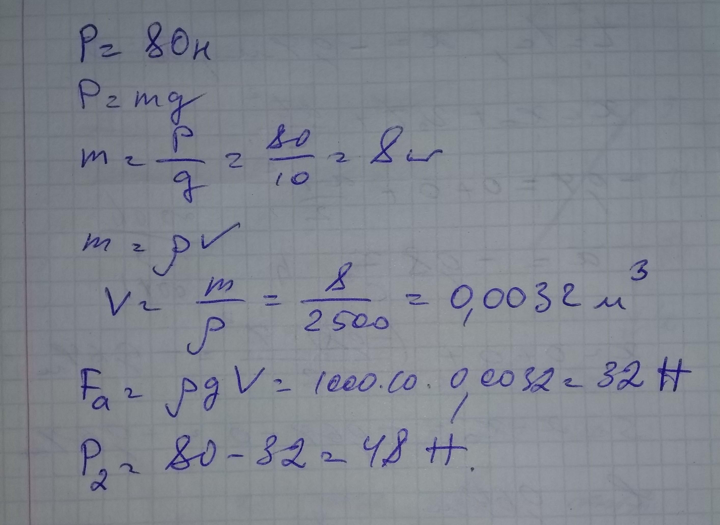 Вычислите вес камня в воде, если его вес в воздухе равен 80 Н (плотность камня 2500 кг/м^3, воды 1000 кг/м^3).