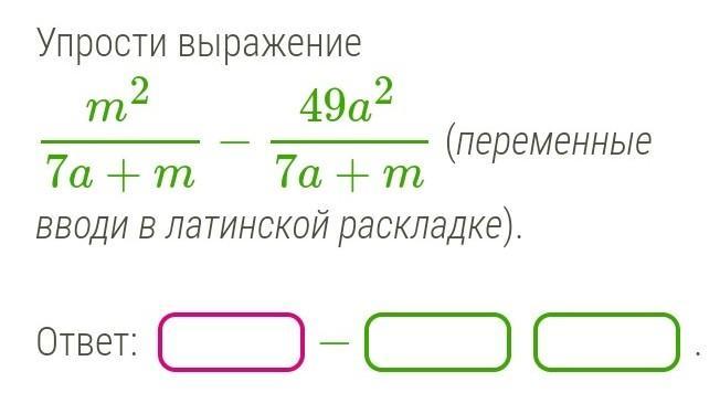 m^2/7a+m - 49a^2/7a+m = m^2-49a^2 / 7a+m = (m-7a)*(m+7a) / 7a+m = m-7a