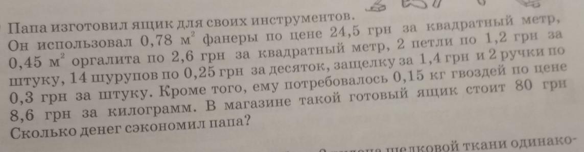 7) 19,11грн + 1,17грн + 2,4грн + 3,5грн + 0,6грн + 1,29грн + 1,4грн = 29,47грн стоит изготовленный папой ящик.