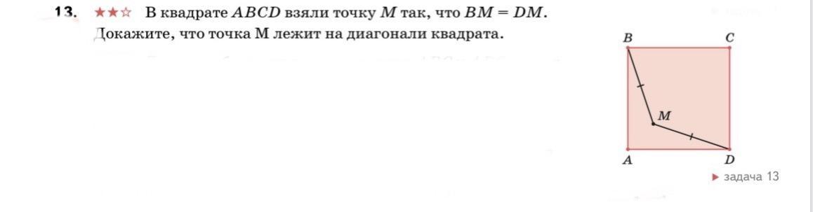 Проведем отрезок АМ. Треугольники АМD и АМВ равны между собой по трём сторонам. Значит углы МАD и МАВ равны между собой. Значит точка М лежит на биссектрисе угла А. Но на этой же биссектрисе лежит диагональ квадрата АС (диагональ квадрата делит углы пополам, этот факт относится к известным свойствам, но и доказывается элементарно из равенства треугольников АСD и АВС).
