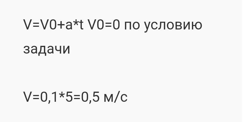V=V0+a*t V0=0 по условию задачи V=0,1*5=0,5 м/с