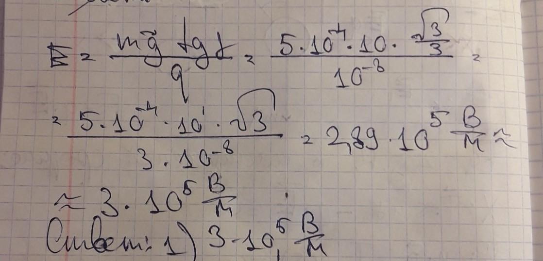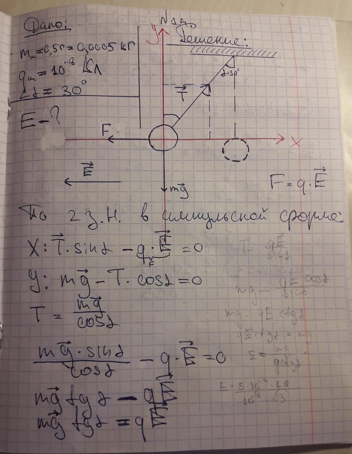 Если подвешанный на непроводящей нити шарик массой 0,5 г с зарядом 10^-8 Кл на нём находится в однородном горизонтальном электрическом поле, то при угле между нитью и вертикалью 30°, напряжённость электрического поля равна