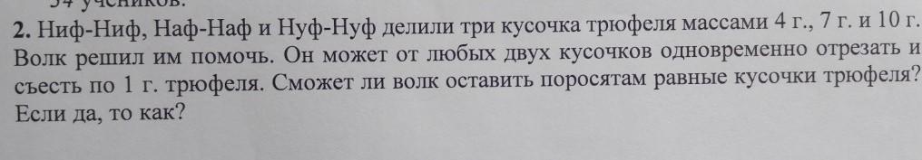 Ниф-Ниф,Наф-Наф,иНуф-Нуф делили 3 кусочка трюфеля.Масса их 4,7,10 грамм.