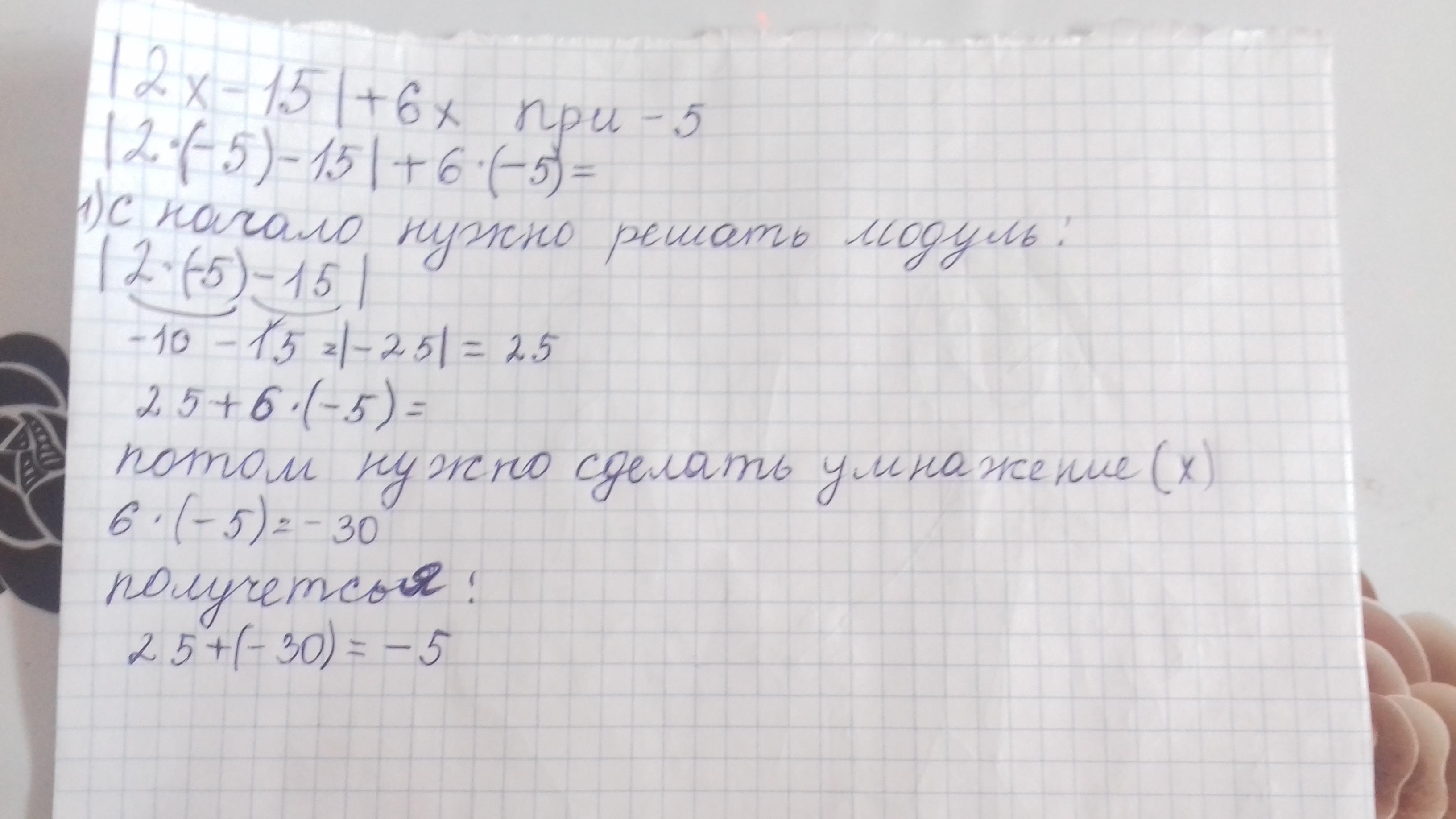 |2*(-5) -15|+6*(-5)= |-25|-30=25-30=-5