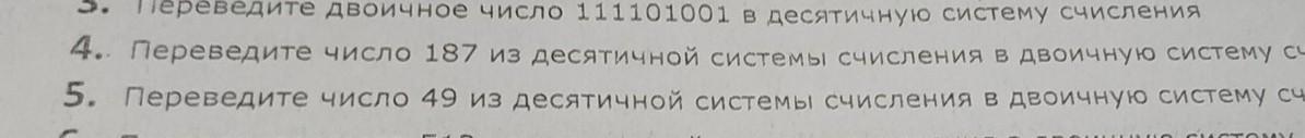 2) 49 целиком не получится, 1 в сторонке, берём 48, 48:2=24. 24 получится, 0 в сторонку, 24:2=12. 12 тоже получится, 0 в сторонку, 12:2=6. 6 тоже получится, 0 в сторонку, 6:2=3. 3 нечётное, берём 2, 1 в сторонку,2:2=1. 1 конечное, приехали, 1 в сторонку.