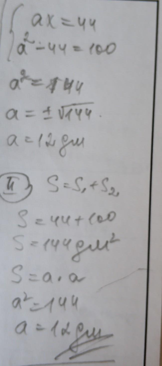 От квадратного листа кровельного железа отрезали полосу площадью 44 дм2. Площадь оставшейся части составила 100 дм2. Найдите сторону квадратного листа кровельного железа. Ответ дайте в дециметрах.