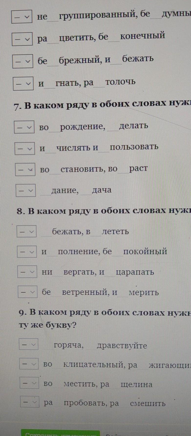в 6 и 8 надо отметит ту строчку в которой стоит только "З", в 7 только "С", а в 9 надо отметить ту строчку там где в обоих словах надо ставить одну и туже букву.