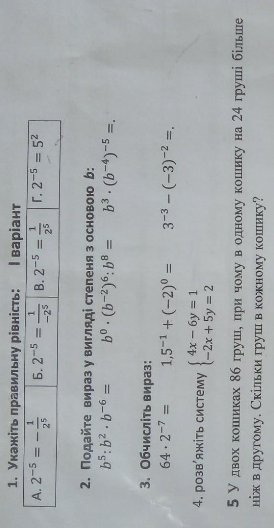 1.в) 2-⁵= 1 поделить на 2⁵. 2) b⁵:b²•b-⁶= b-³. Дальше не знаю)