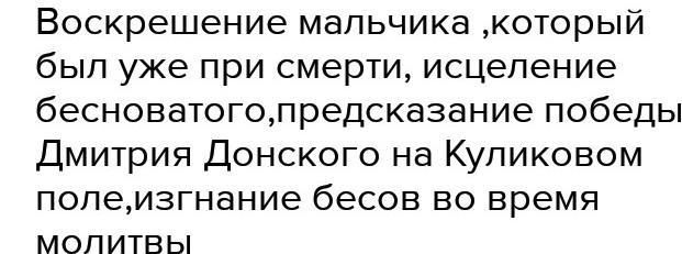 воскрешение мальчика,который был уже при смерти,исцеление бесноватого,предсказание победы Дмитрия Донского на Куликовом поле, изгнание бесов во время молитвы