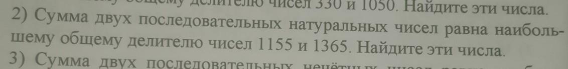 2) Сумма двух последовательных натуральных чисел равна наибольшему общему делителю чисел 1155 и 1365. Найдите эти числа.
