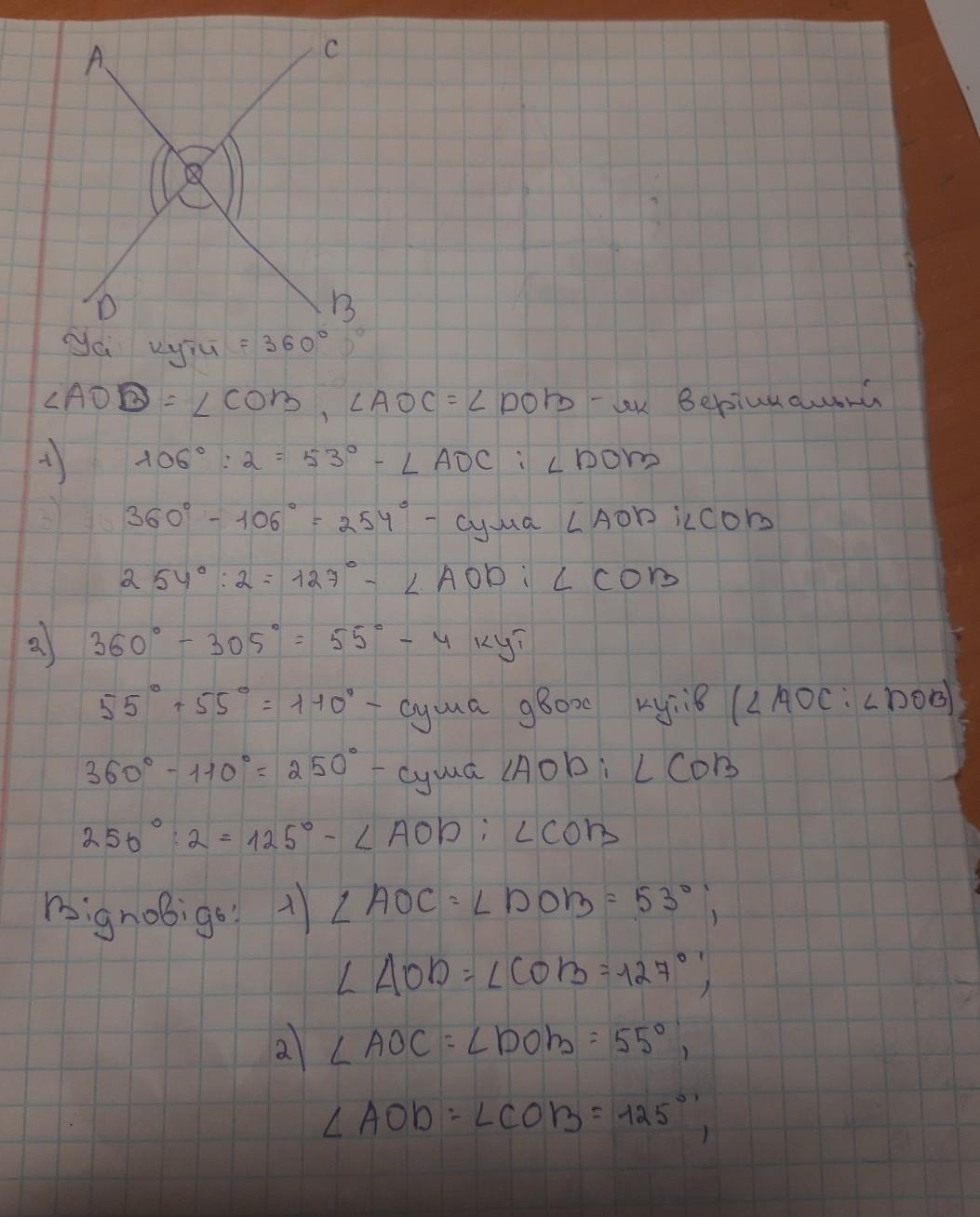 Знайдіть кути, які утворилися при перетині двох прямих якщо: 1) сума двох із них дорівнює 106° 2) сума трьох із них дорівнює 305°