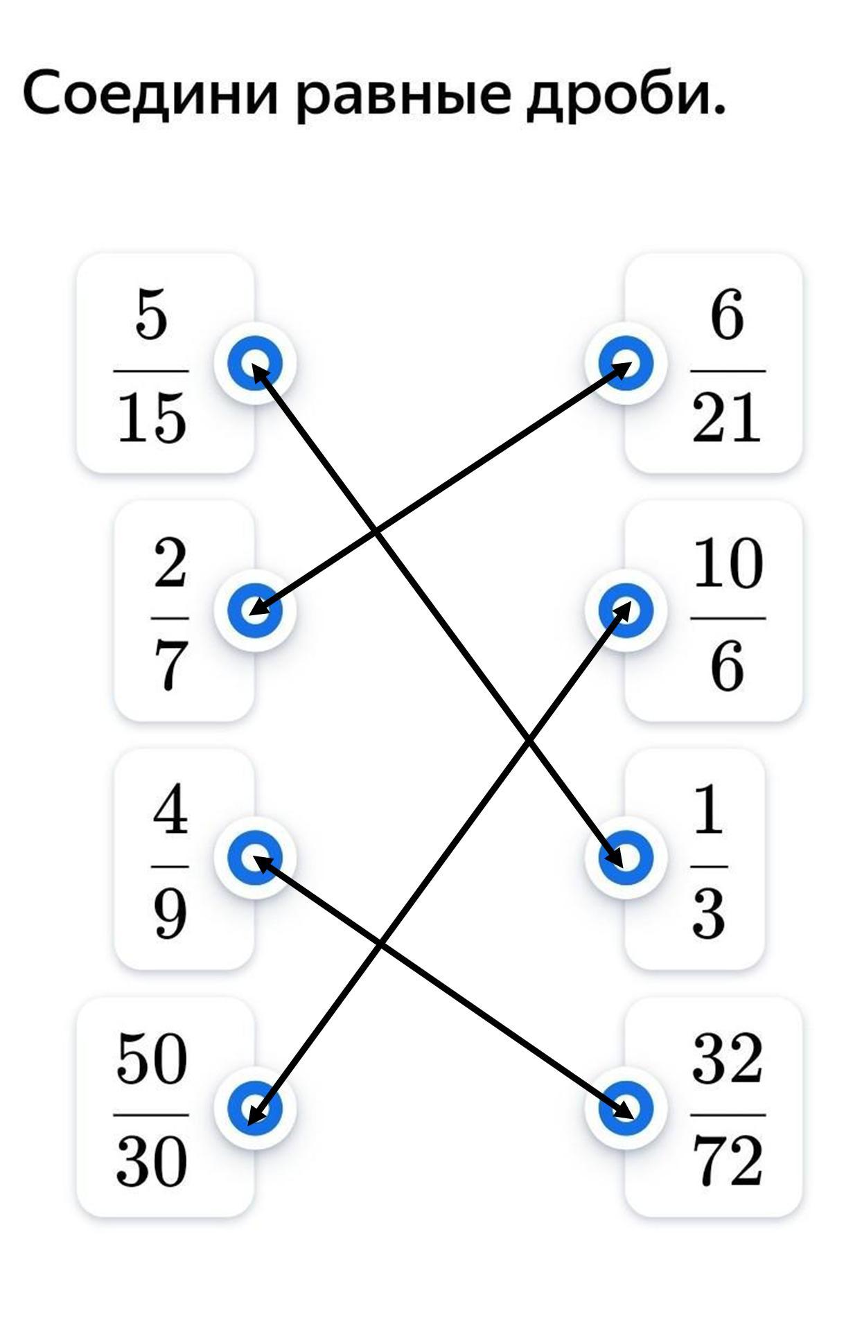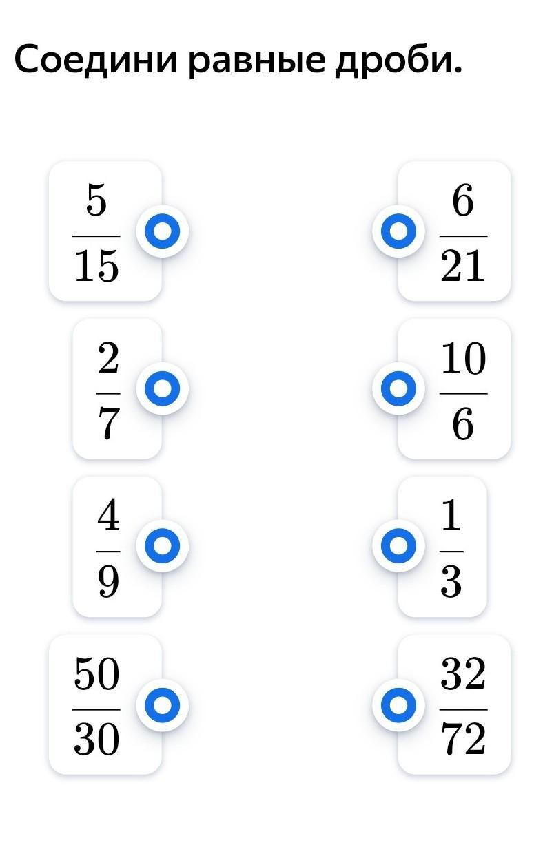 Ответ: 5/15-1/3; 2/7-6/21; 4/9-32/72; 50/30-10/6.