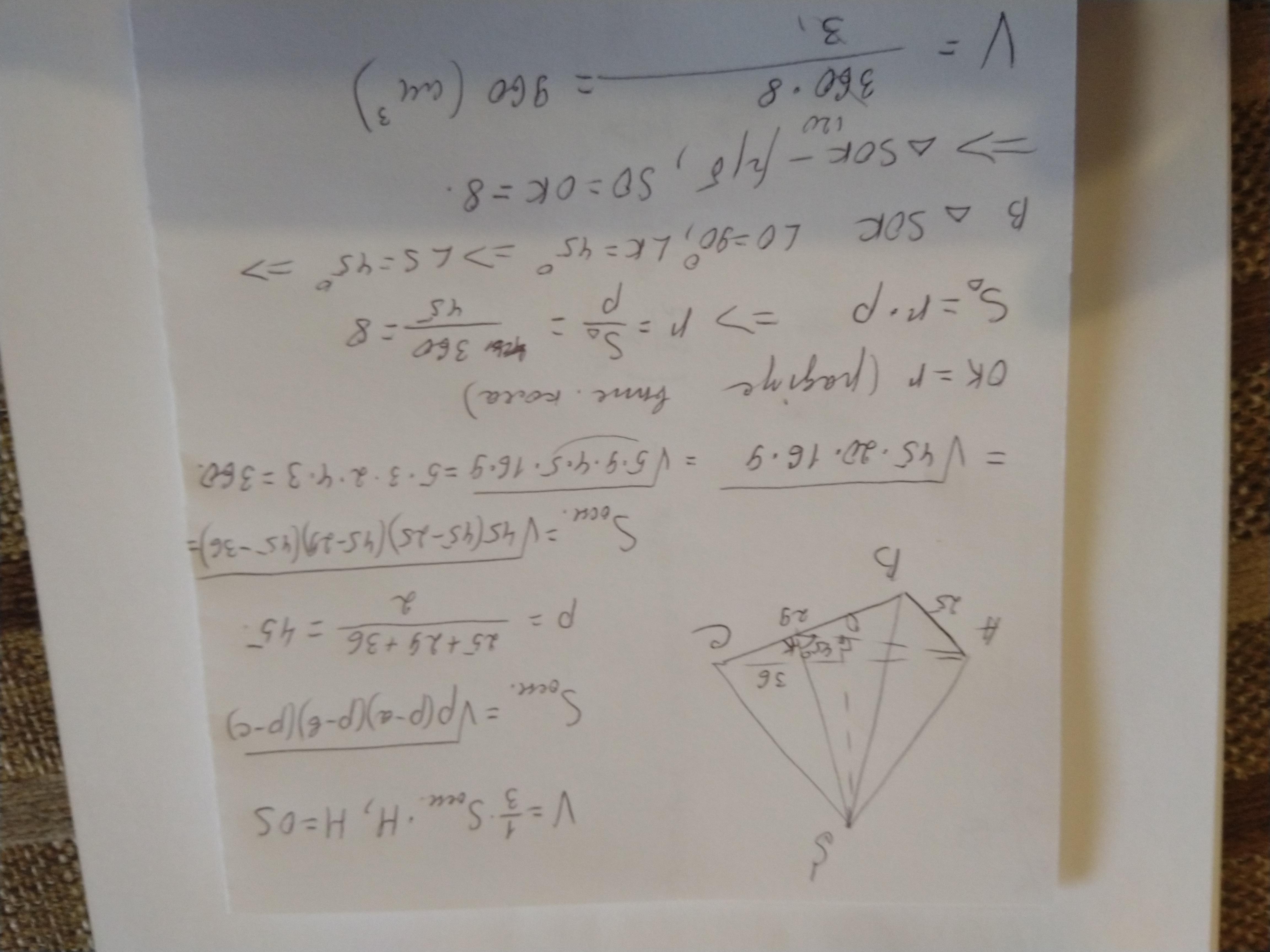 Знайти об'єм піраміди в основі якої лежить трикутник зі сторонами 36 см, 25 см, 29 см. Всі бічні грані нахилені до площини під кутом 45 градусів