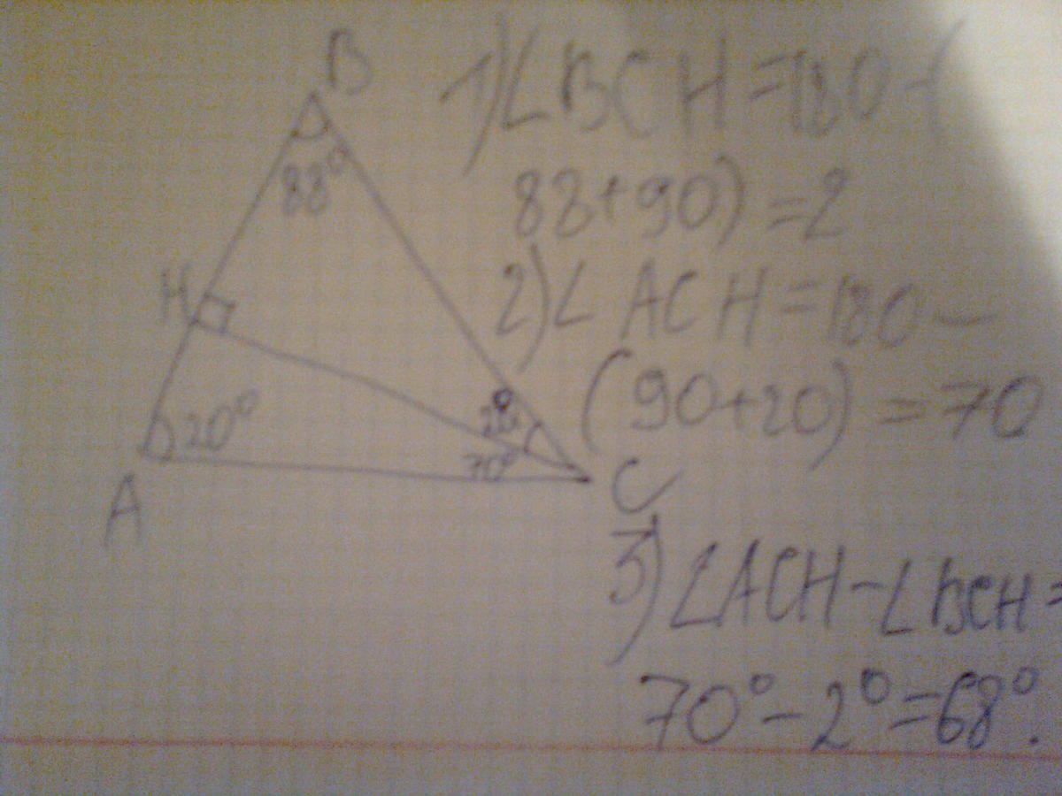 В треугольнике АВС угол А равен 200, угол В равен 880, СН – высота. Найдите разность углов АСН и ВСН. Ответ дайте в градусах.
