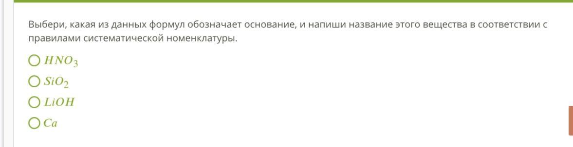 Основанием является LiOH (гидроксид лития), т. к. соединение имеет металл IA группы и гидроксогруппу.