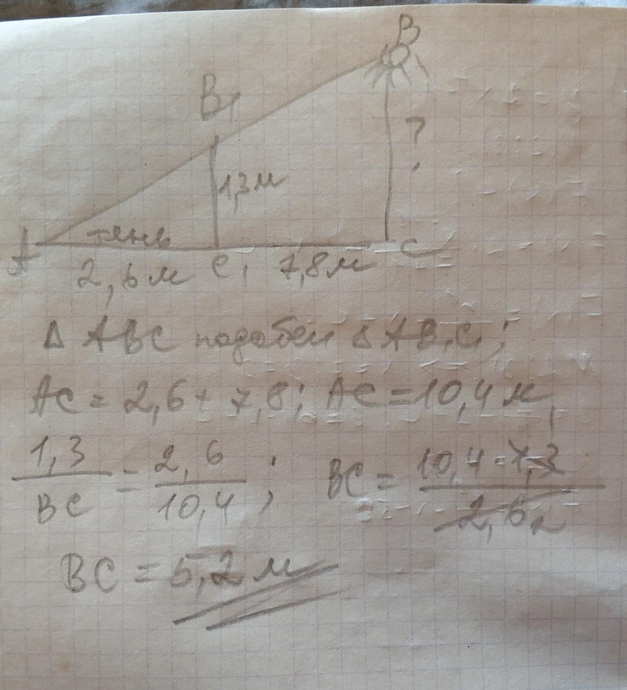 Человек ростом 1,3м стоит на расстоянии 7,8 м от столба, на котором висит фонарь. Длина тени человека 2,6 м. На какой высоте установлен фонарь? Ответ дайте в метрах.
