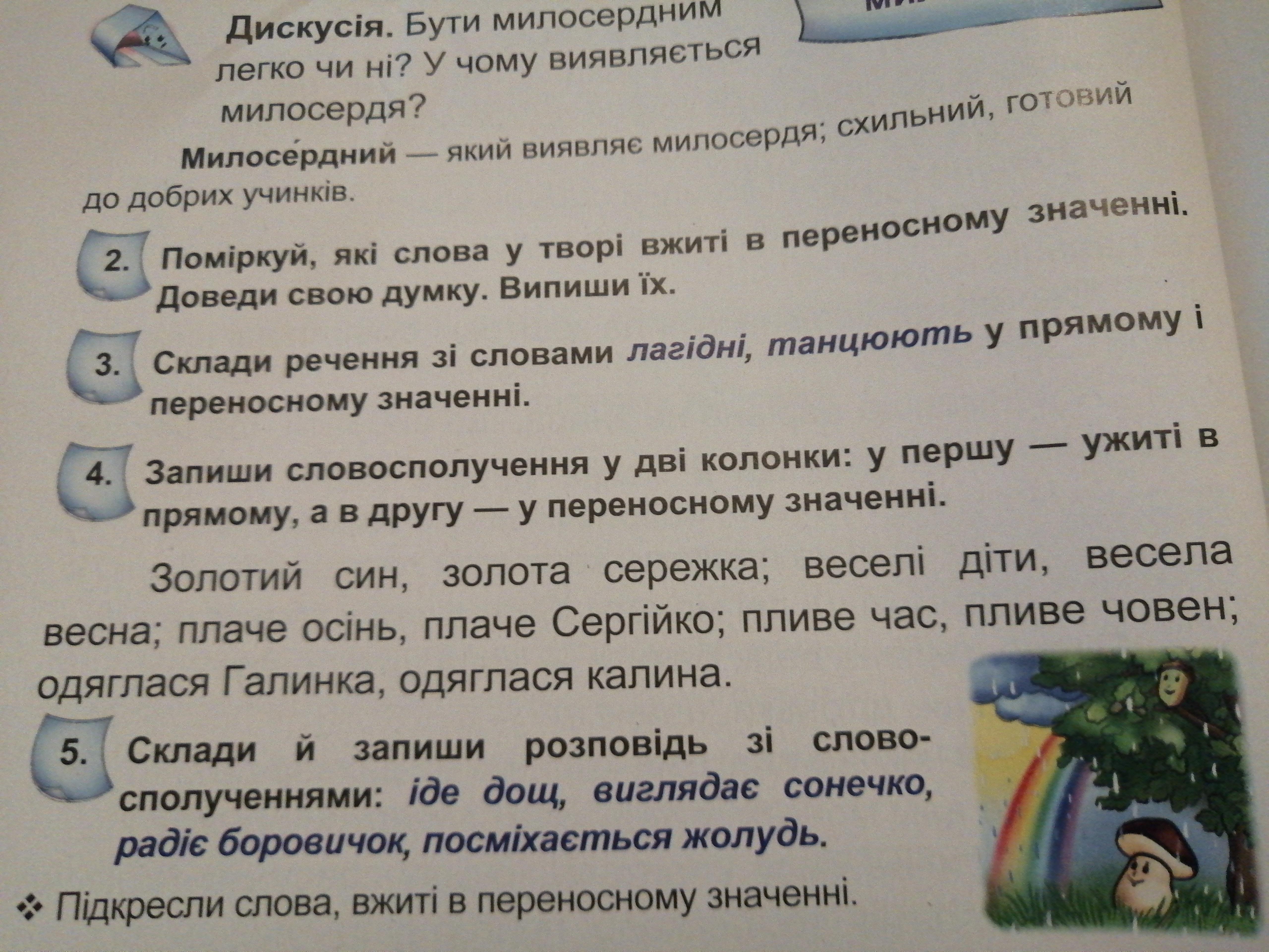 Ужиті в прямому значенні: Золота сережка,веселі діти, плаче Сергійко, пливе човен, одяглася Галинка.