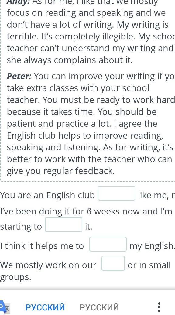 Andy: Oh! That’s no good! I personally like it. I’ve been in the club for a little longer than you. I think it helps me to improve my English. I like the way we learn the language. It is less formal than usual class and not quite traditional. We mostly work on our own or in small groups. We are independent learners and we get instructions from the teacher only at the beginning of the meeting.