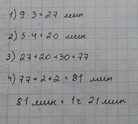 27+2+20+2+30+2+2+2= 87 минут =1час 27 минут