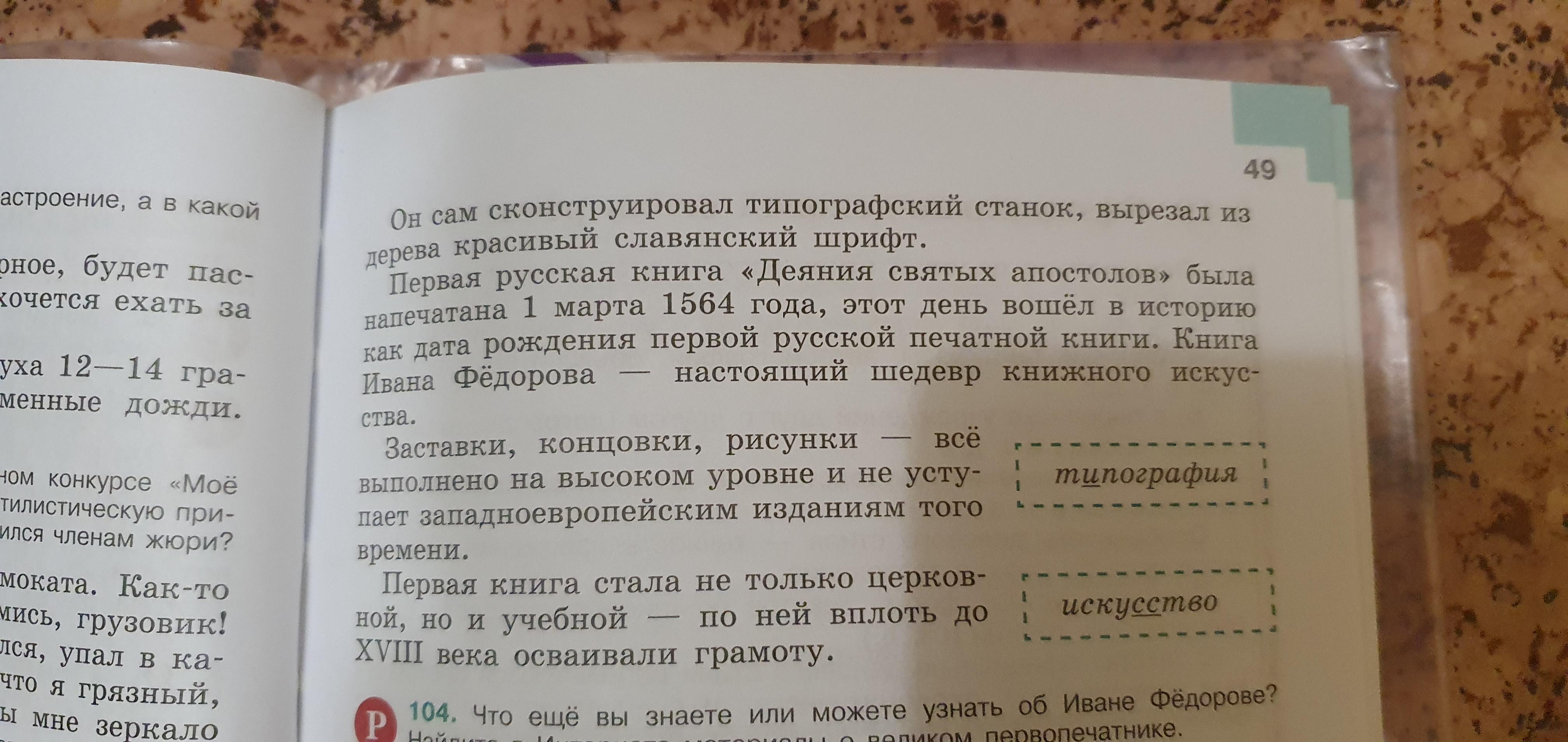 Иван Федоров - первопечатник. В 1563 г. царь Иван Четвертый и митрополит Макарий и царь Иван Грозный поручают Ивану Федорову создать типографию. ОН получил прекрасное образование, логично мыслил и любил читать. Ученым ничего неизвестно о том, где родился Иван ФедоровИван Федорович Московитин совместно с Петром Мстиславцем (Тимофеевичем) создал " Апостол" - первую книгу на Руси ( вышла в свет в 1564 в Москве). В ней не было ошибок, оформление и шрифт - идеальные. Вторая книга называлась " Часослов".В 1574 во Львове напечатана первая славянская " Азбука" и снова " Апостол. " В 1581 появилась " Острожская Библия "В Москве возник Печатный Двор, выпускавший книги религиозного содержания. Это было потом, а первым печатником был Федоров.