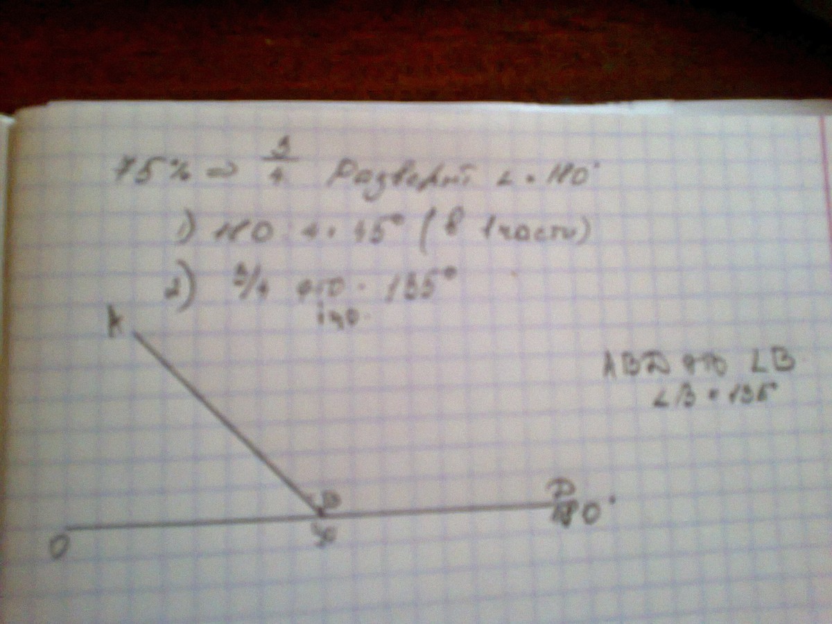 Построй с помощью транспортира угол В, если известно, что он равен 75% развернутого угла.
