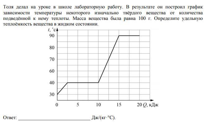 1. До достижения температуры 40°С вещество находилось в твёрдом состоянии. Для его нагрева от 30°С до 40°С затрачена энергия Q1=2,5-0=2,5 кДж.