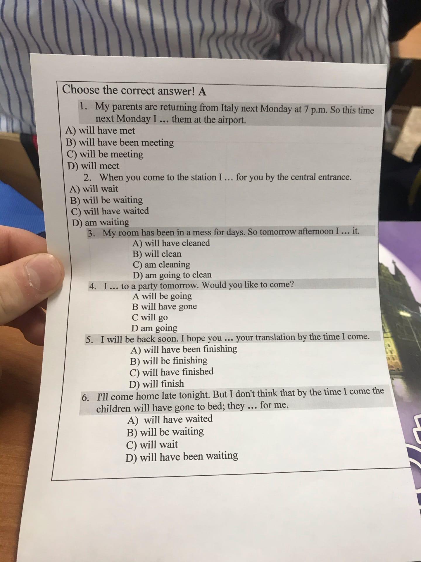 5) C will have finished (он должен закончить перевод до того, как кто-то вернется, выбираем Future Perfect)