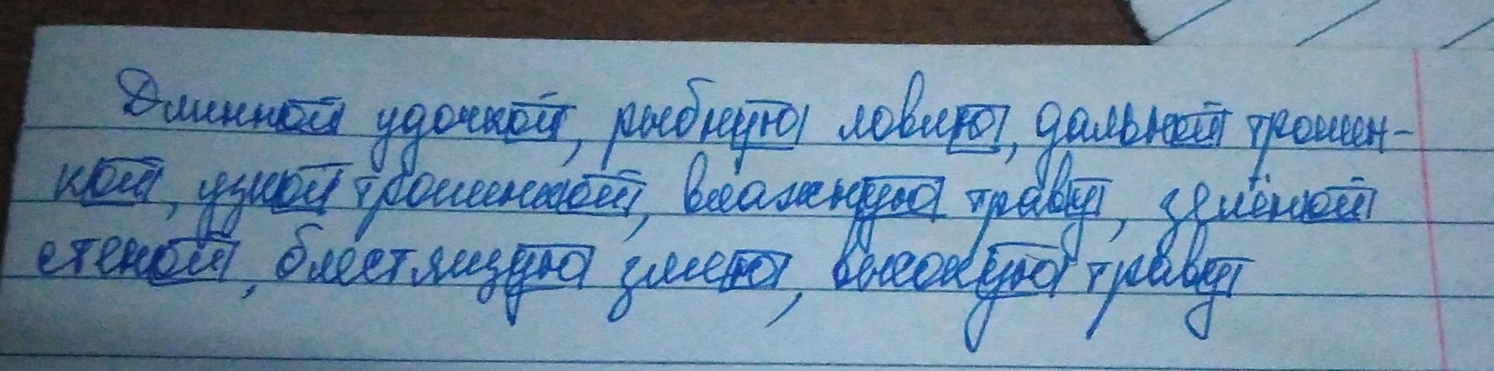 Ответ:с длинной удочкой, на рыбную ловлю, дальней тропинкой, узкой тропинкой, влажную траву, зелёной стеной, блестящую змею, в высокую траву