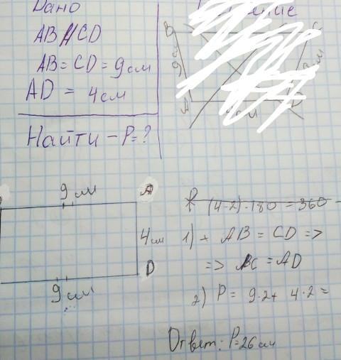 дите периметр четырехугольника, если AB = CD = 9 cm, AD = 4 cm.