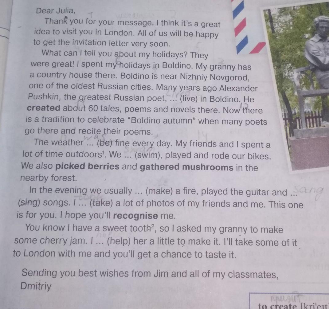 Уважаемая Юля, Спасибо за ваше сообщение. Я думаю, это отличная идея навестить вас в Лондоне. Все мы будем рады очень скоро получить пригласительное письмо. Что я могу рассказать о своих отпусках? Они были прекрасны! Отдыхала в Болдино. У бабушки там загородный дом. Болдино находится недалеко от Нижнего Новгорода, одного из старейших городов России. Много лет назад Александр Пушкин, величайший русский поэт, .. (живет) в Болдино. Здесь он создал около 60 сказок, стихов и романов. Сейчас есть традиция отмечать «Болдинскую осень», когда многие поэты ходят туда и читают свои стихи. Погода ... будет хорошей каждый день. Мы с друзьями много времени проводили на природе ». Мы .. (плавали), играли и катались на велосипедах. Еще мы собирали ягоды и грибы в ближайшем лесу. По вечерам мы обычно ... (разводим) костер, играем на гитаре и ... (поем) песни. L ... (делаем) много фотографий моих друзей и меня. Этот для тебя. Надеюсь, ты меня узнаешь. Вы знаете, что я сладкоежка? Поэтому я попросила бабушку приготовить вишневое варенье. Я ... (помогаю) ей немного сделать это. Я возьму его с собой в Лондон, и вы сможете его попробовать. Передаю вам наилучшие пожелания от Джима и всех моих одноклассников Дмитрия.